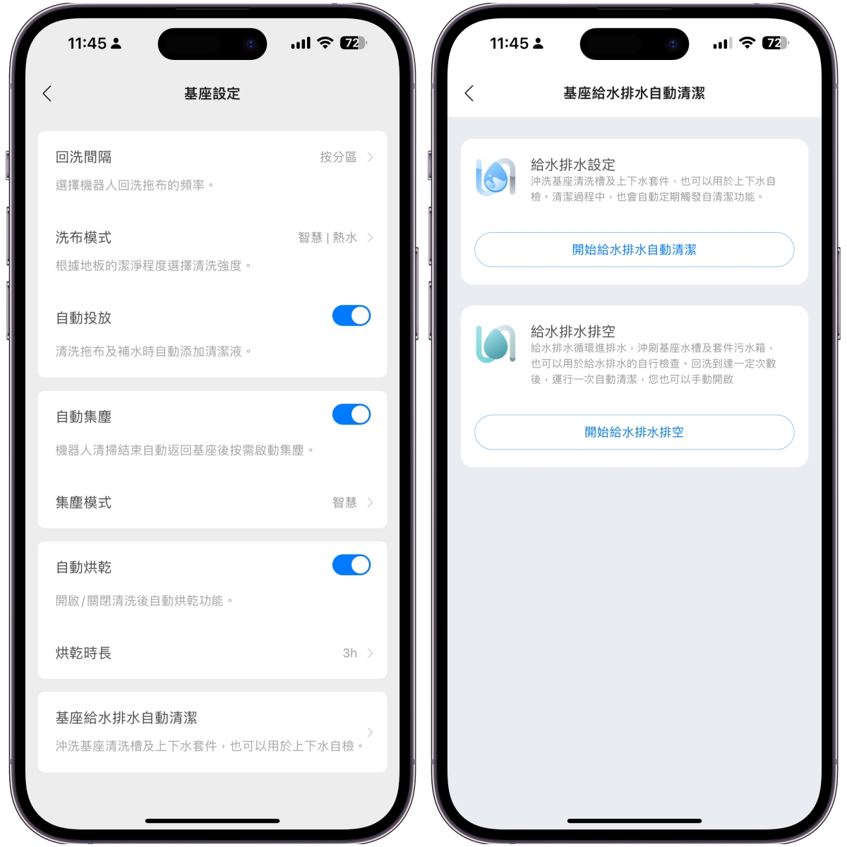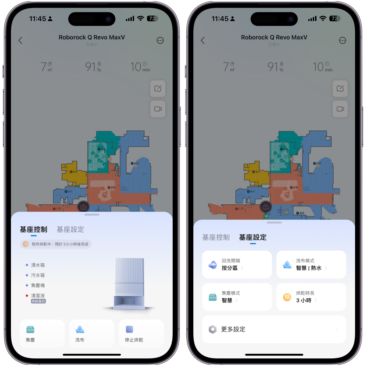 基座控制及設定裡,除了查看狀態外,還可以設定洗拖布的熱水溫度、回洗間隔、集塵模式跟烘乾時間,原則上照預設就可以了。