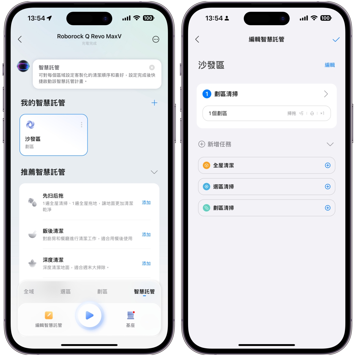 智慧託管的部份,可以在這裡設定你想要的各種清掃方式,用來因應各種需求,你就不用每次為了不同需求手動設定,只要按一下就搞定。