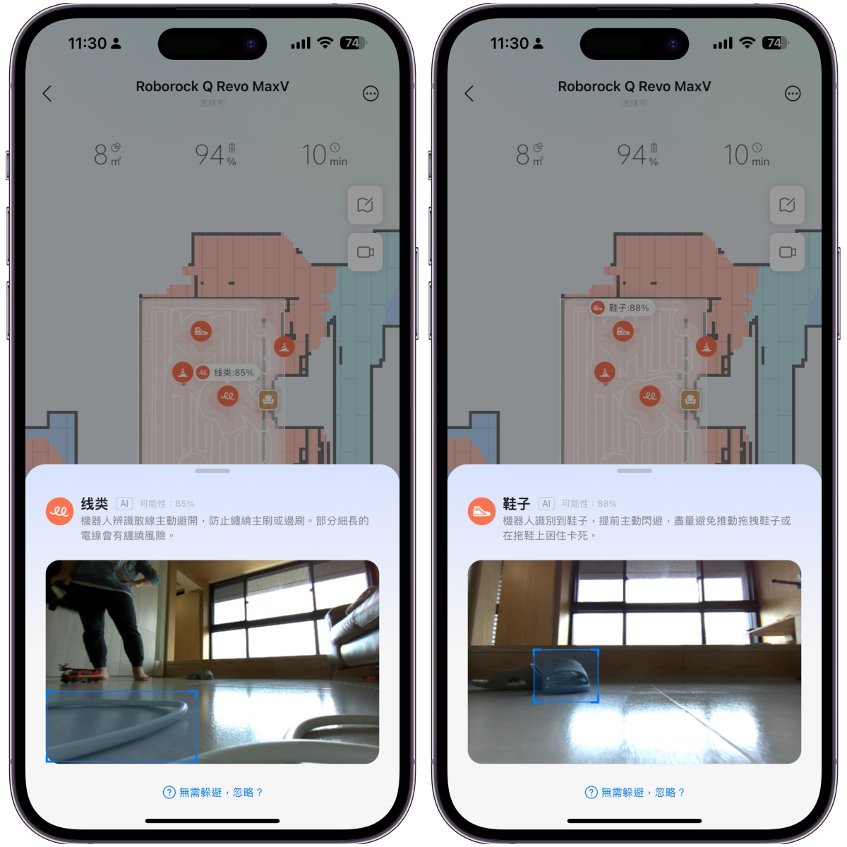 視覺辨識到底有沒有用?很多人抱著懷疑的態度,在 App 裡,每次清掃完後,都會顯示所有偵測到的障礙物,點擊後就能查看它辨識到的照片,這樣你就知道家中到底有哪些東西會被辨識出來。