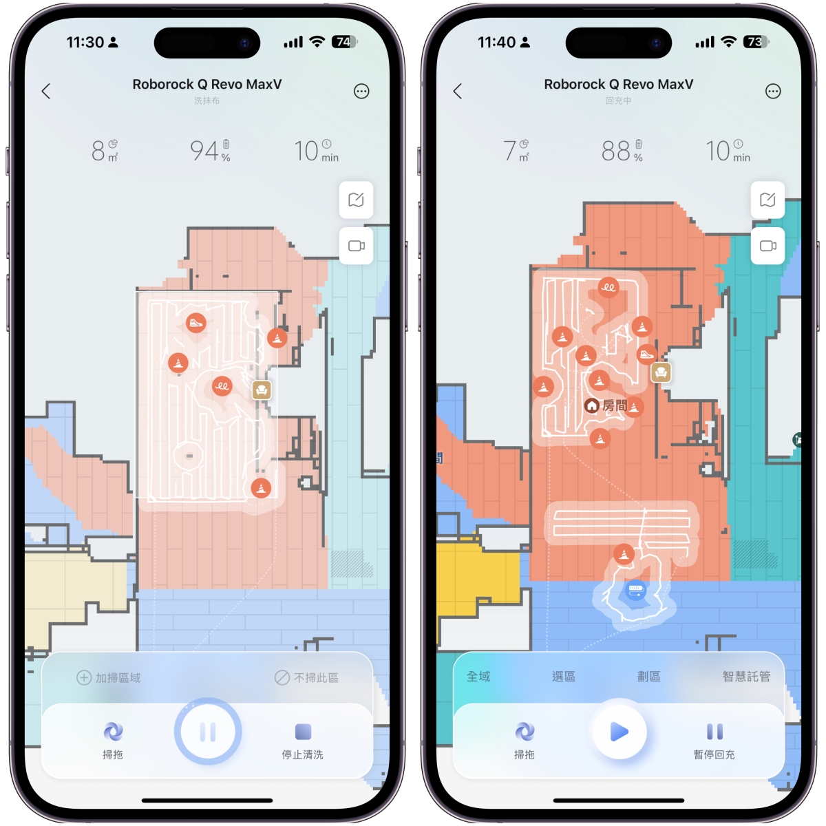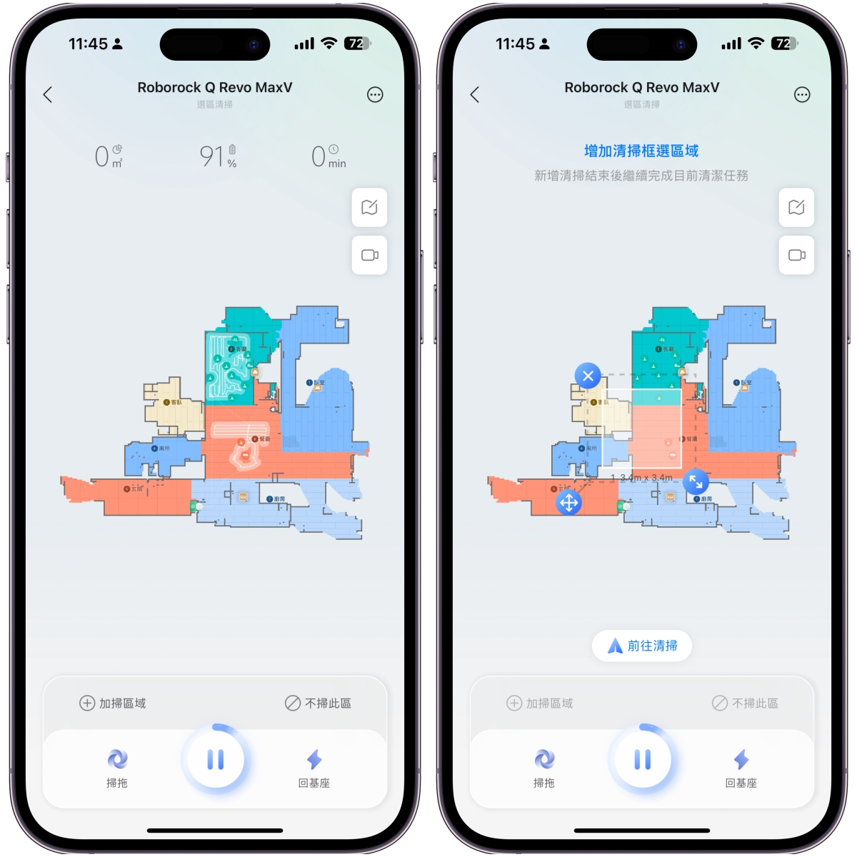 另外,當你打掃到一半,比如原本是只想掃 A 區,但你臨時在 B 區弄髒了地板有即時性的需求,可以直接按加掃此區後,圈選範圍就會先去掃你加掃的地方,這超實用。