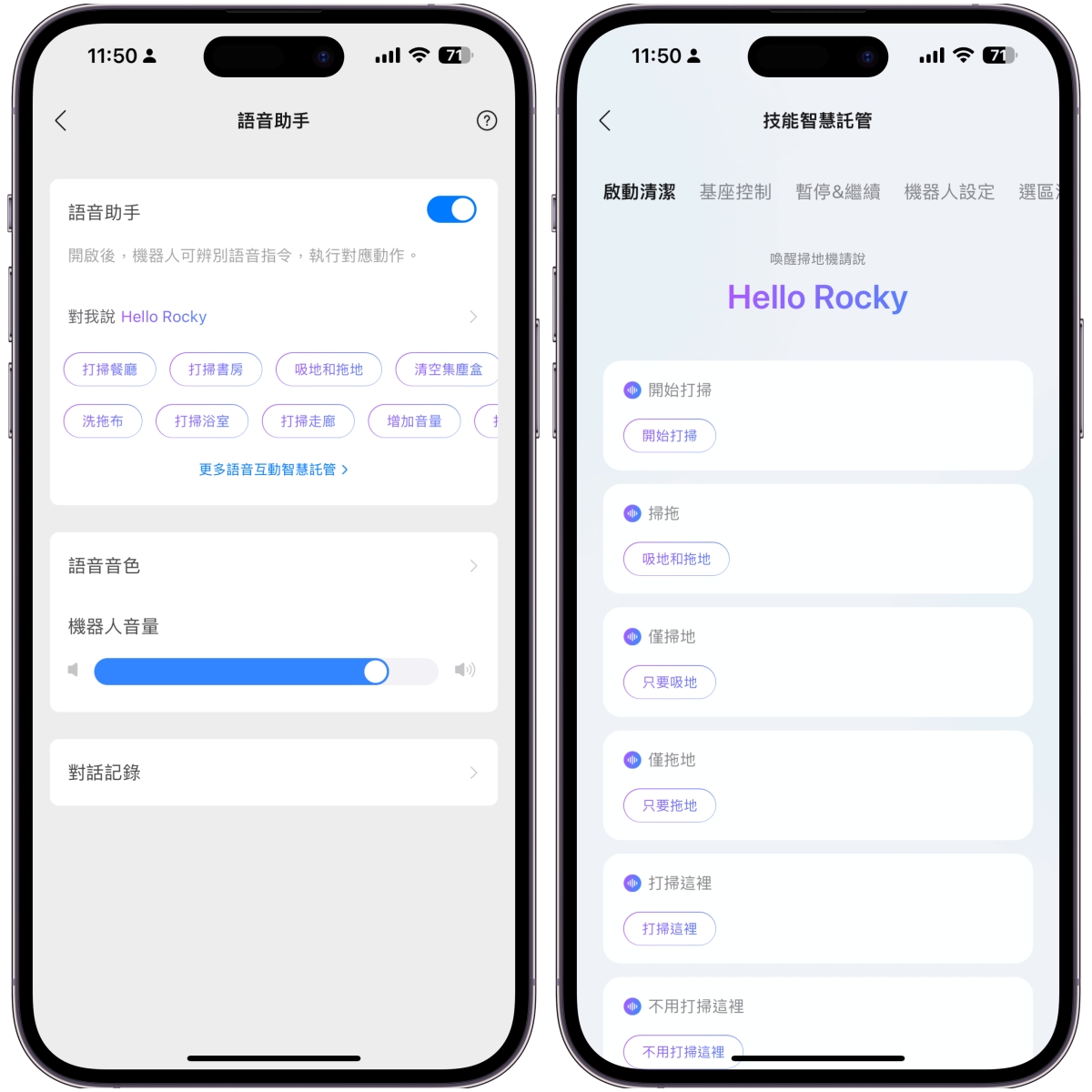 這次 Q Revo MaxV 最棒的部份就是有了語音助手,前面我有提到先把分區做好,因為當你想要打掃某一區時,完全不用打開 App,直接對著機器說 Hello Rocky,就可以給它指令,比如打掃客廳、或是打掃廚房等,各種基本的指令在語音助手設定中也可以查看,指令超多超細。