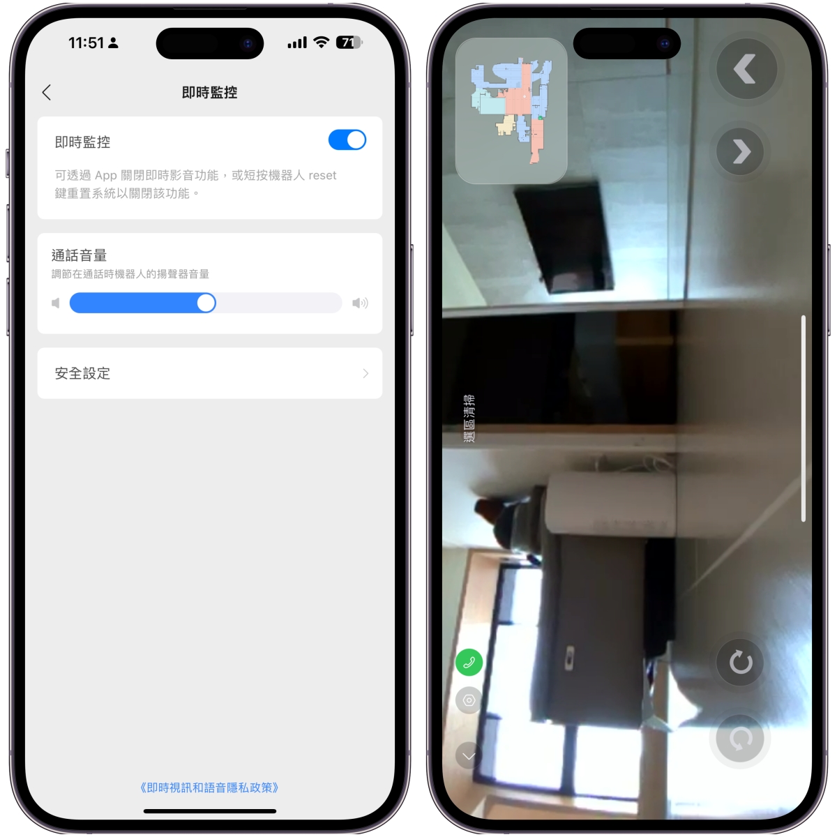 前方的鏡頭如果你想要使用的話,需要先在設定裡開啟即時監控並且設定圖形密碼才能使用,監控畫面也都經由加密處理,大家就放心吧。