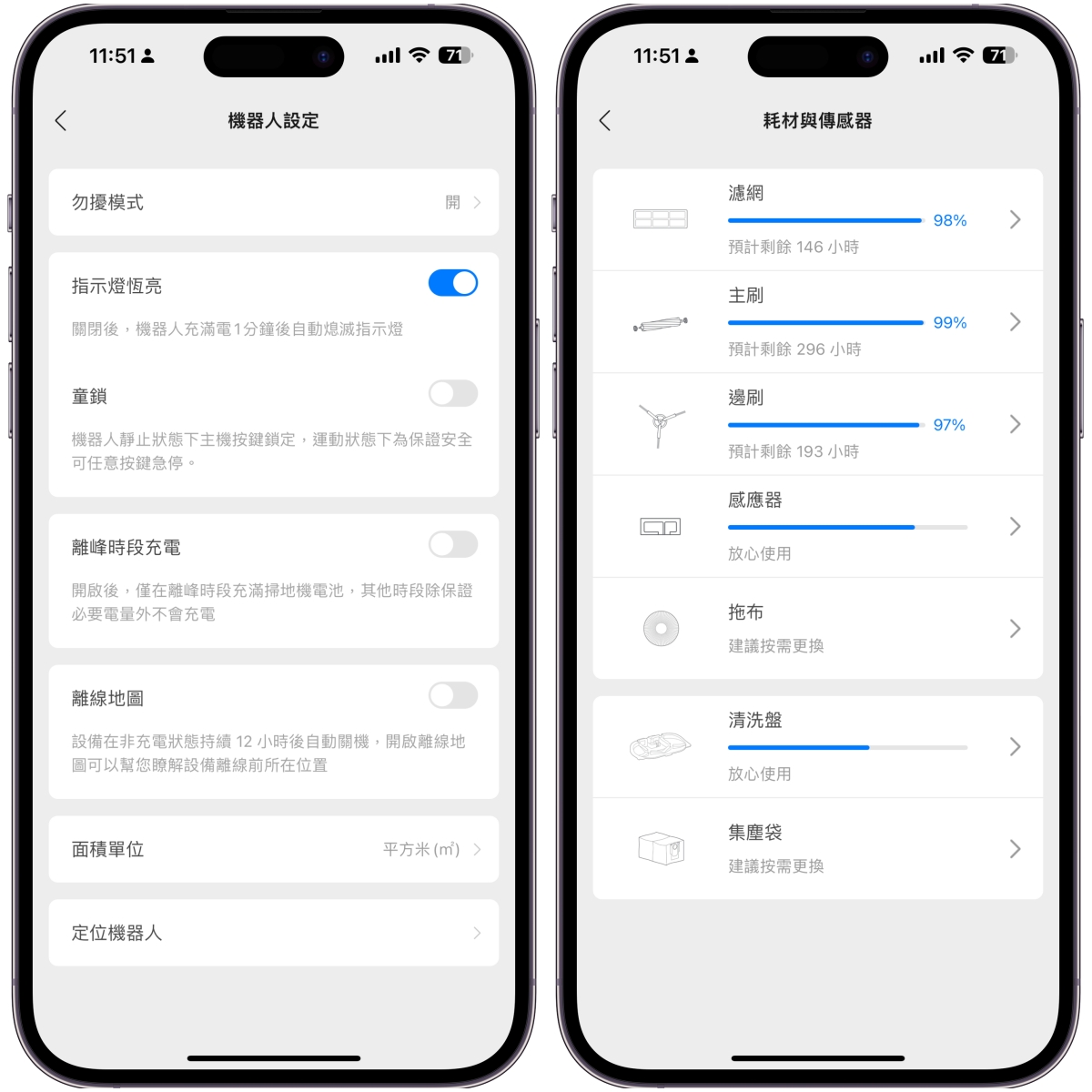 其它還有更多設定包括童鎖、離峰時間充電設定等也都很實用,而耗材跟傳感器相關也都可以在這裡查看相關資訊,就知道是否要更換或清洗了。