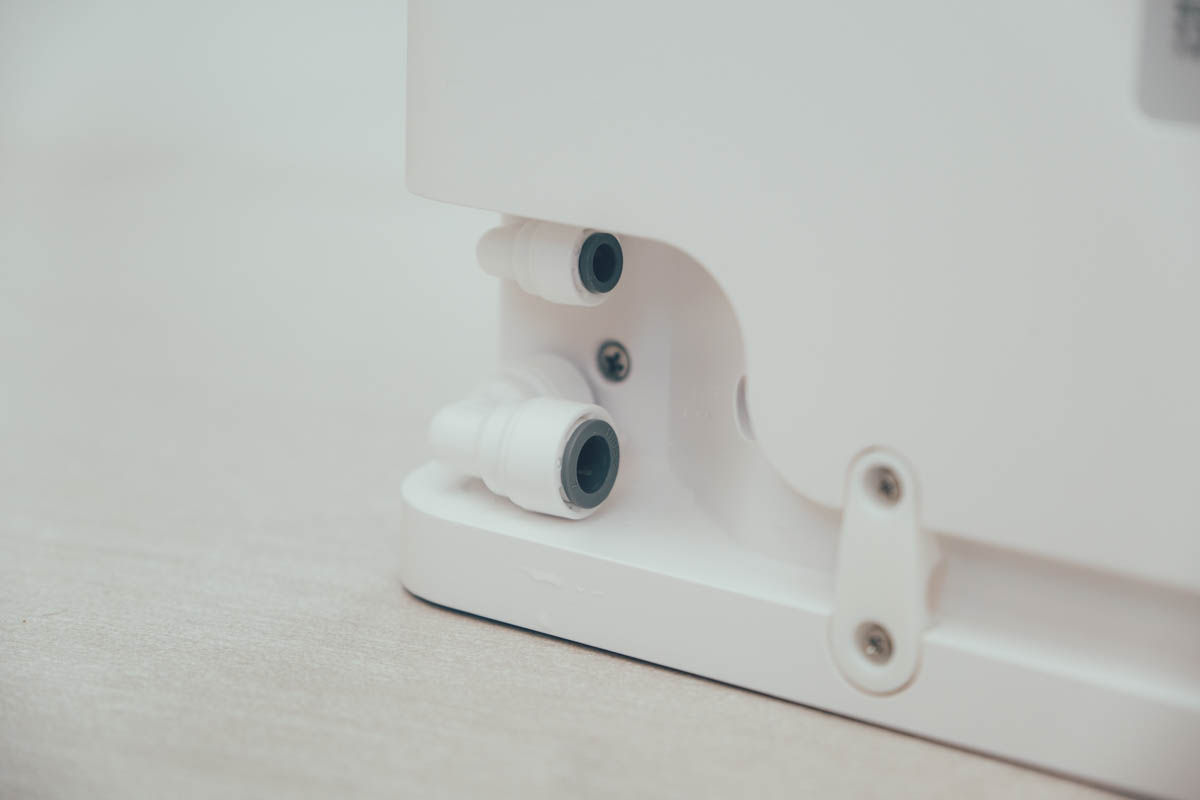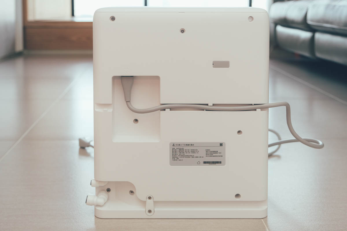 背面除了供電之外,在左下角是進水跟排水孔,我已經接上了原配件附的 L 型管線。