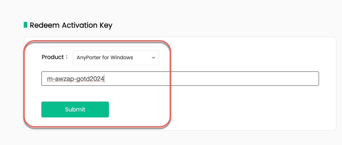 登入成功後,就可以在 Redeem Activation Key 這裡選擇 AnyPoter for Windows,然後輸入收到的序號送出。