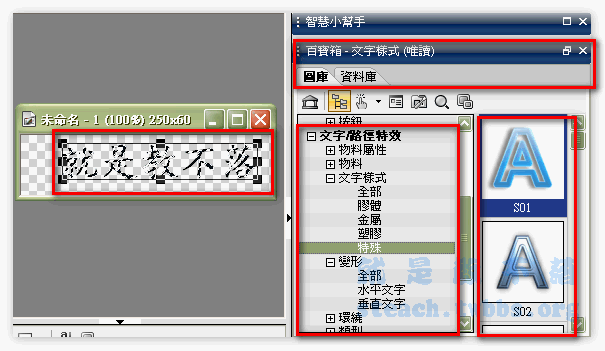 百寶箱找你想要使用的文字樣式,裡面的種類很多,像是膠體
