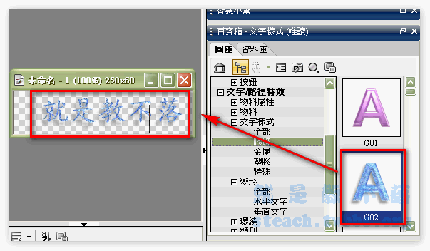 金屬、塑膠等等,可以多試幾個,點二下會直接套用到文字上可以預覽一下,如果不喜歡再按復原(Ctrl+Z)就可以了,試到喜歡為止。