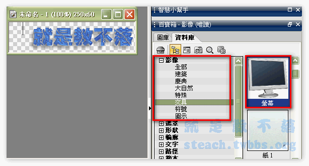 百寶箱現成的影像來添加,如果要自己添加網路找的素材,利用上面的物件→插入影像物件→從檔案即可,假設部落格內容以電腦為主,那放個電腦圖示也不為過吧!點擊圖示二下。