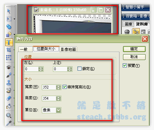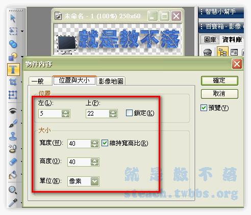影像右鍵內容來調整一下物件內容的位置和大小,我們先調大小,再來調位置一開始設定了高度只有60像素的底圖,那圖示就大約調個40、40