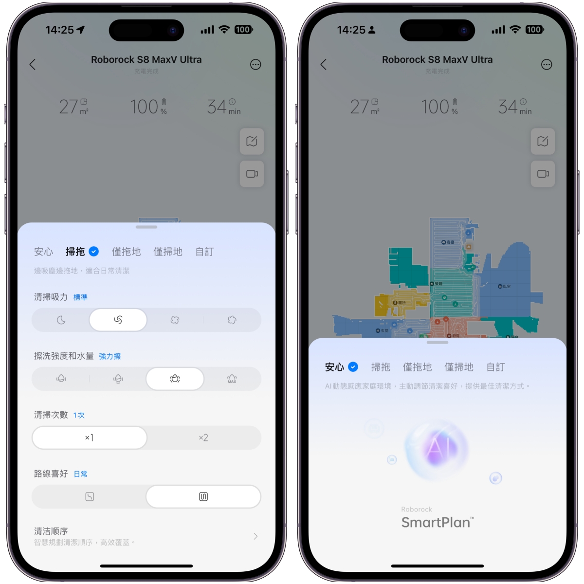 掃拖的模式有各種方式可以自訂,而這次的 S8 MaxV Ultra 我發現還多了個「安心模式」,簡單的說,就是自動的幫你選擇清潔模式,完全自動判斷。