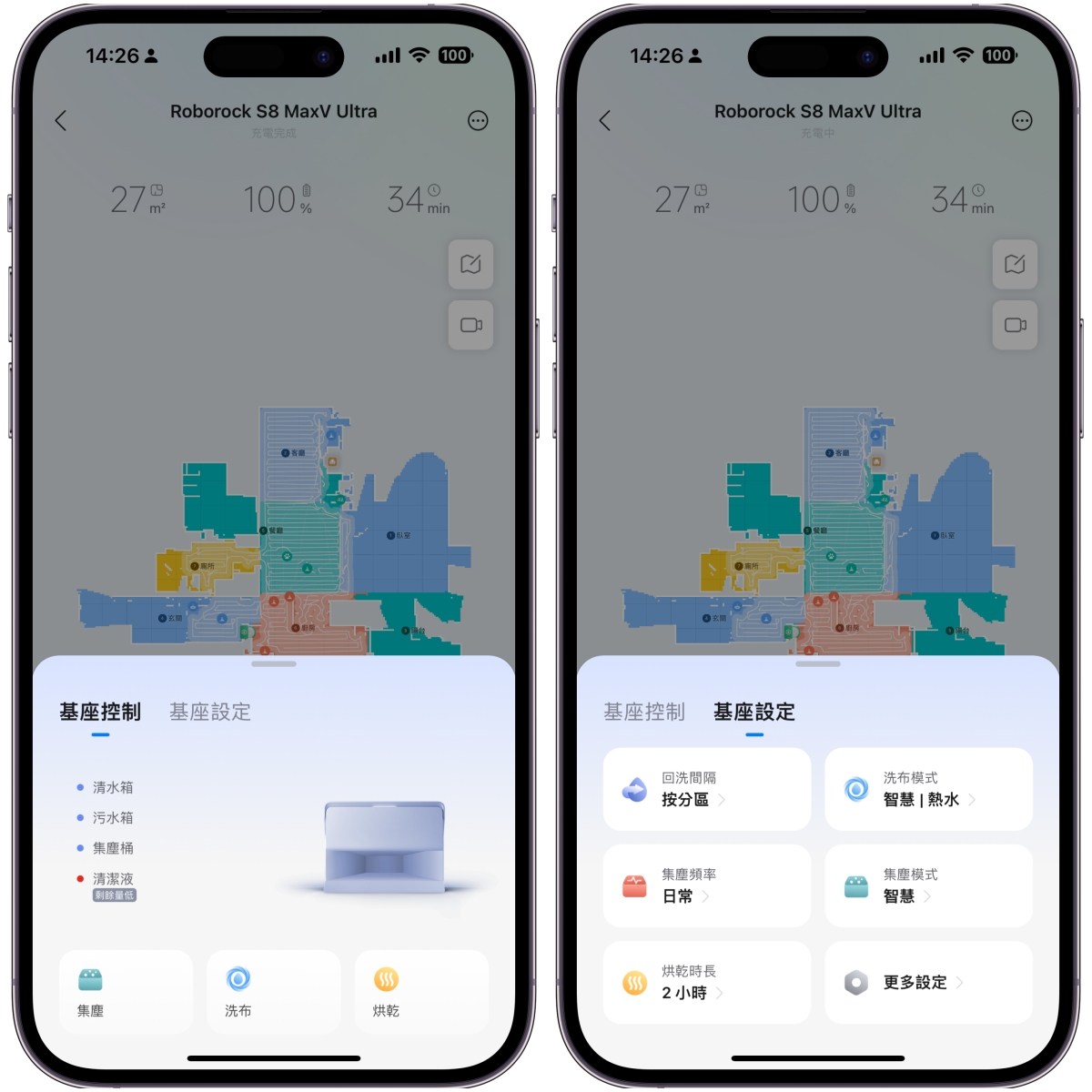 基座的資訊中,可以查看基座的相關資訊,以及設定相關控制選項,包括回洗間隔、洗布模式、集塵頻率、集塵模式、烘乾時長等,而這次的雙通道熱風烘乾提升到 60 度的高溫,建議可以設定 2 小時就好,已經足以烘乾拖布了。