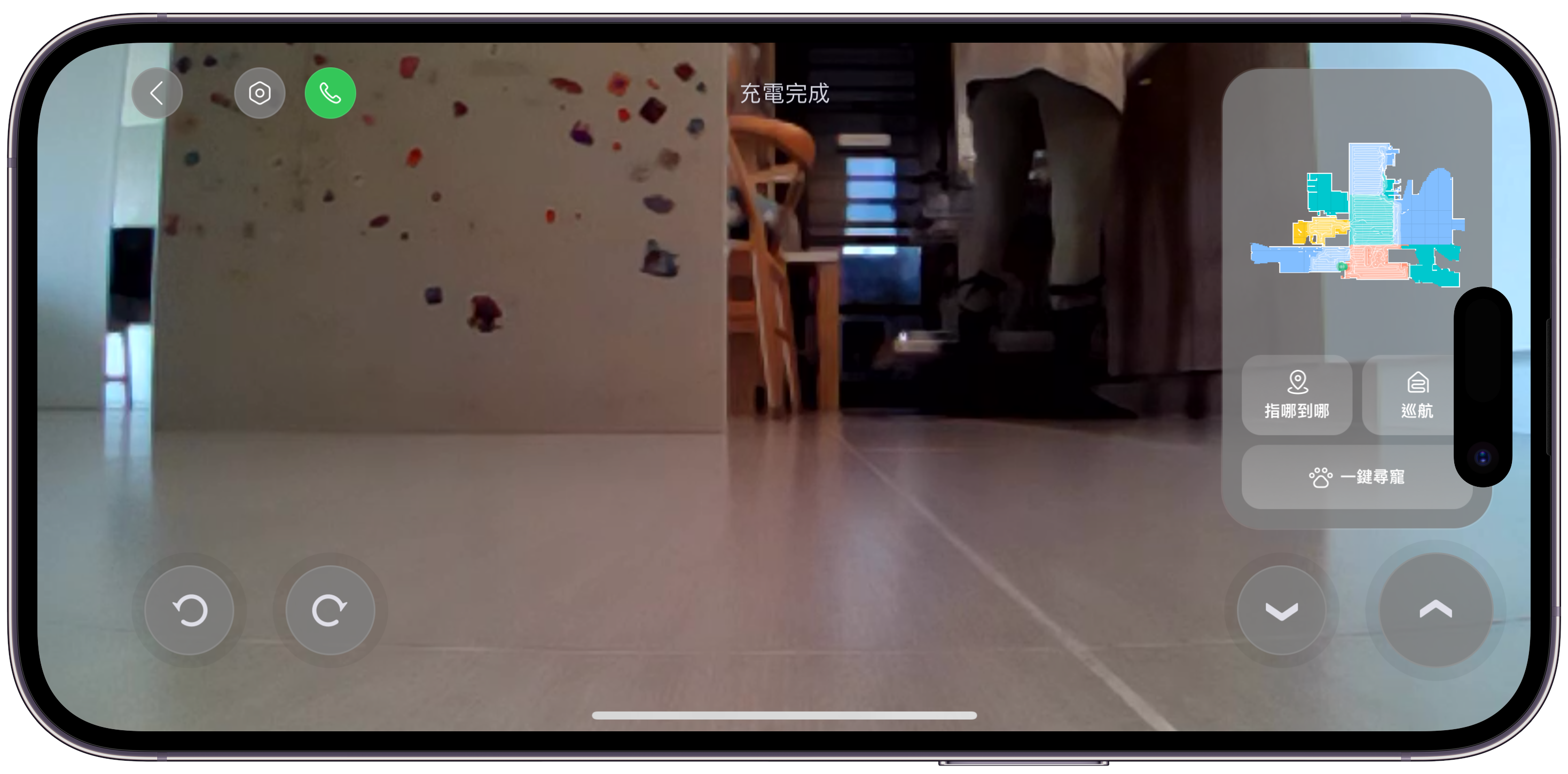 這次我在開啟即時視訊功能時,發現介面有點不同,除了可以控制方向跟語音通話外,右邊居然多了個「一鍵尋寵」,按下去後就會到處去巡邏,搜尋寵物的位置,然後拍照。