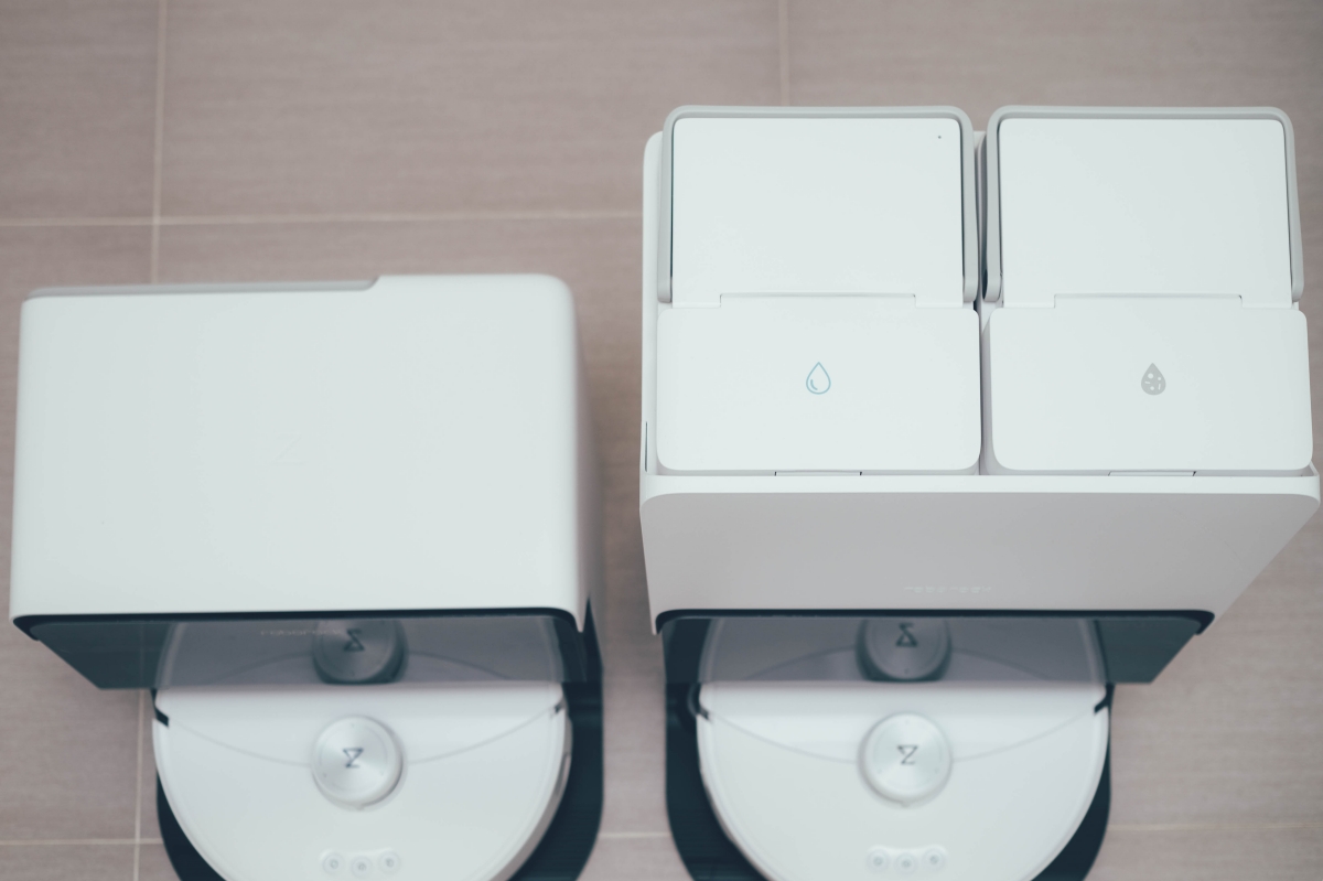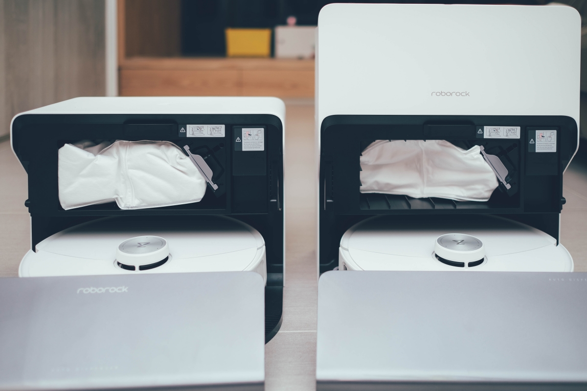 首先我們來看一下大家最關注的體積的部份,這次石頭科技推出 S8 MaxV Ultra 時,我就已經先去查了國外的官方網站,第一眼看到照片時就覺得太不可思議了,這體積也太小了吧,光是這高度就可以屌打一大堆掃地機器人,雖然現在蠻多品牌都有做自動上下水的功能,但是體積這麼小是唯一一台,做成這麼小一台最大的好處就是,更不佔用家裡的空間,很多人在一開始改用「有基座」的掃拖機器人後,都覺得愈來愈大台,現在要預留的空間都變大了,而這次 S8 MaxV Ultra 可以看到,左邊的水立方(自動上下水版),比起右邊的水箱版小了超多,而且不得不説,在全部的掃拖機器人中,石頭科技的設計可以說是數一數二的好看,每次推出新款都可以看的出來變化,而不是千篇一律的「類似設計」。