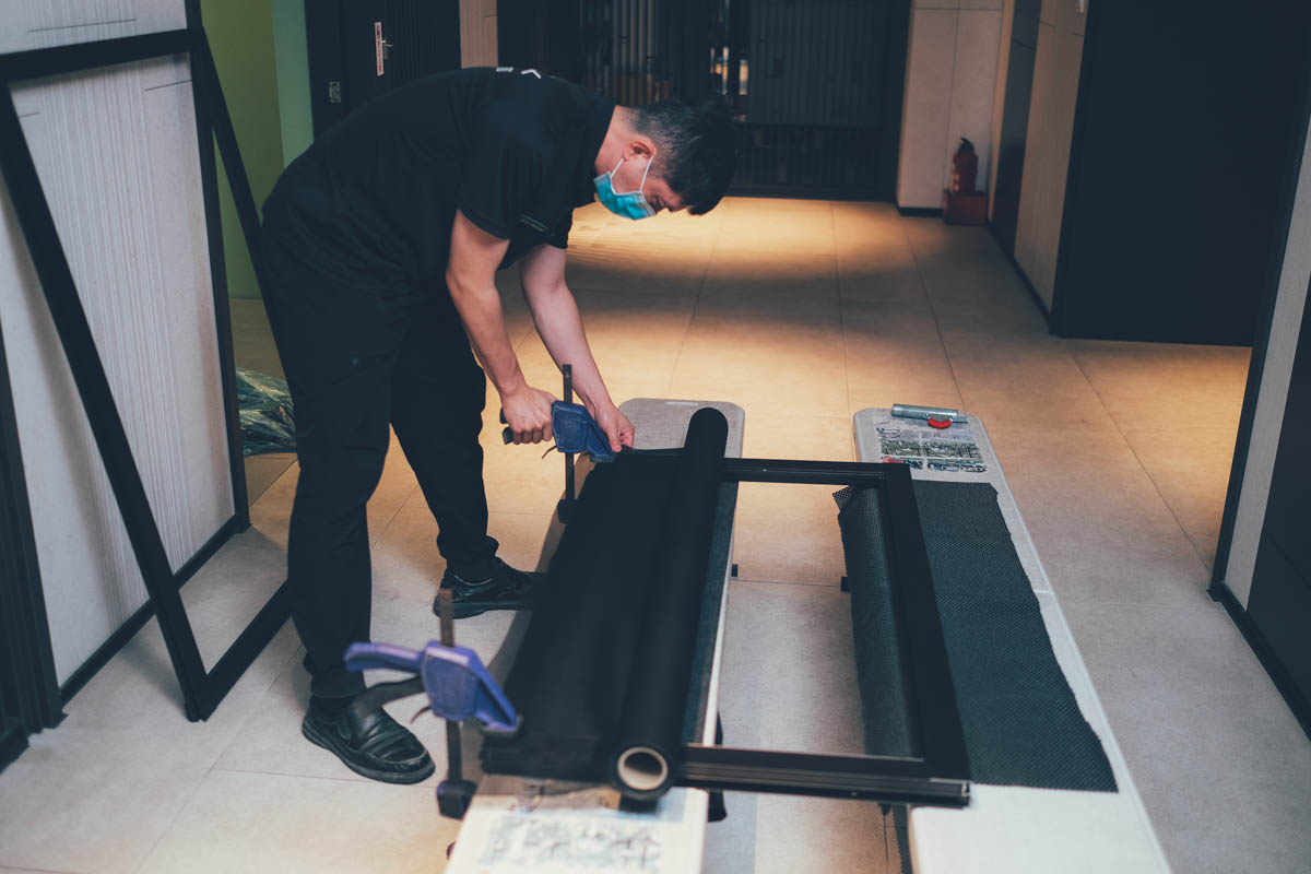 然後一一的丈量將防霾紗網固定上去,在這期間我也詢問了施工人員,一般如果沒有原本的紗窗框的話,比如像我們社區是可以在陽台安裝防霾紗窗,這種會怎麼製作,他們則是會連帶框一起製作,紗窗可以選擇不同方式來開關,所以家中除了既有紗窗外,如果有對外開口想要安裝防霾紗窗也是沒有問題的。