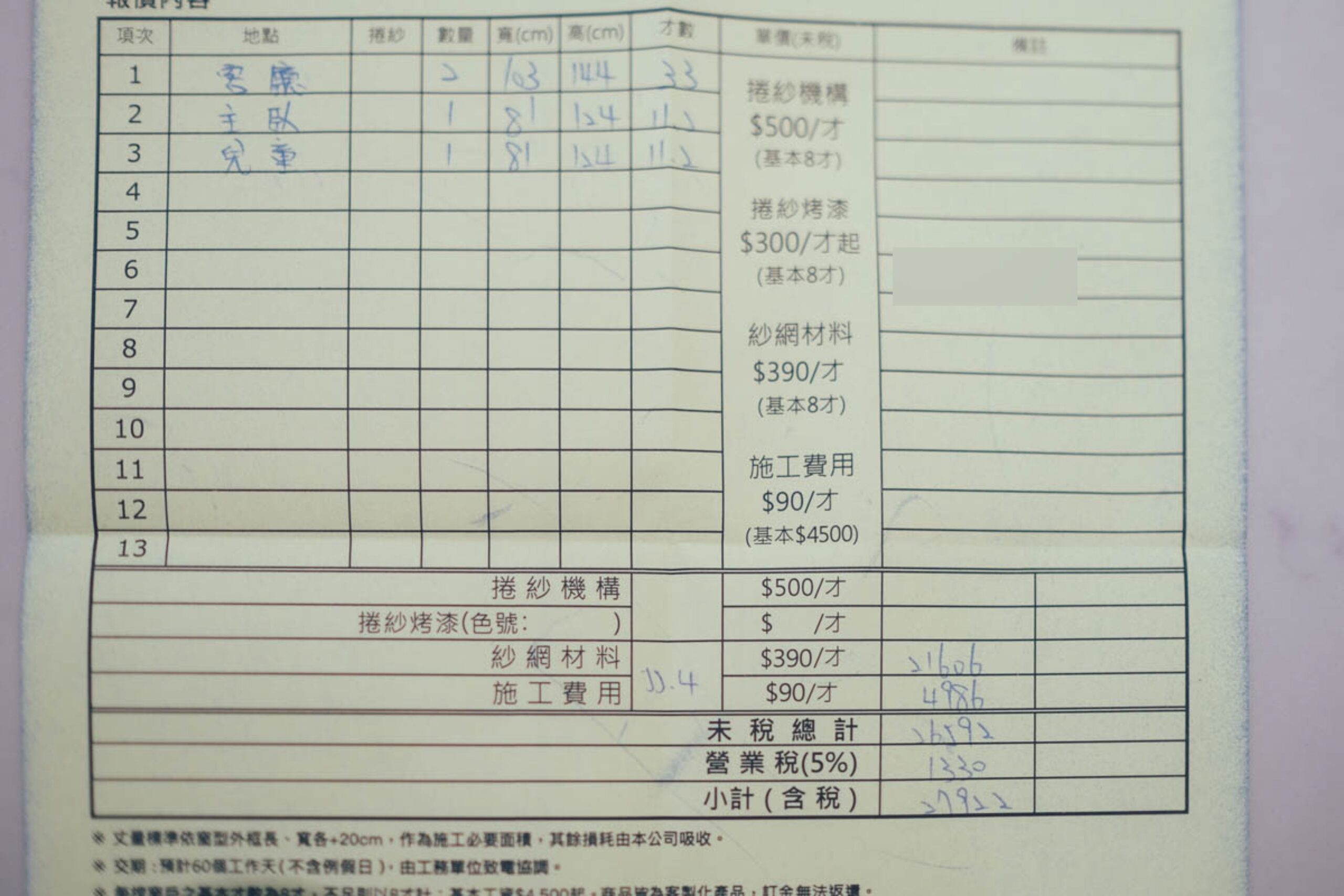不囉嗦,直接秀一波我的報價單,如果是單純要換紗網,費用就是每才 390 再加上施工費每才 90,價格在報價單上公開透明,也不會隨便哐你,我在三年多前房子裝潢時我就曾經問過一家防霾紗窗業者,二次報價都不同,一問之下,回我的答案是:「前一個業務報價報錯」,哇塞,如果價差幾百塊就算了,我那二個不同業務報出來價差五千多,各位觀眾這合理嗎?