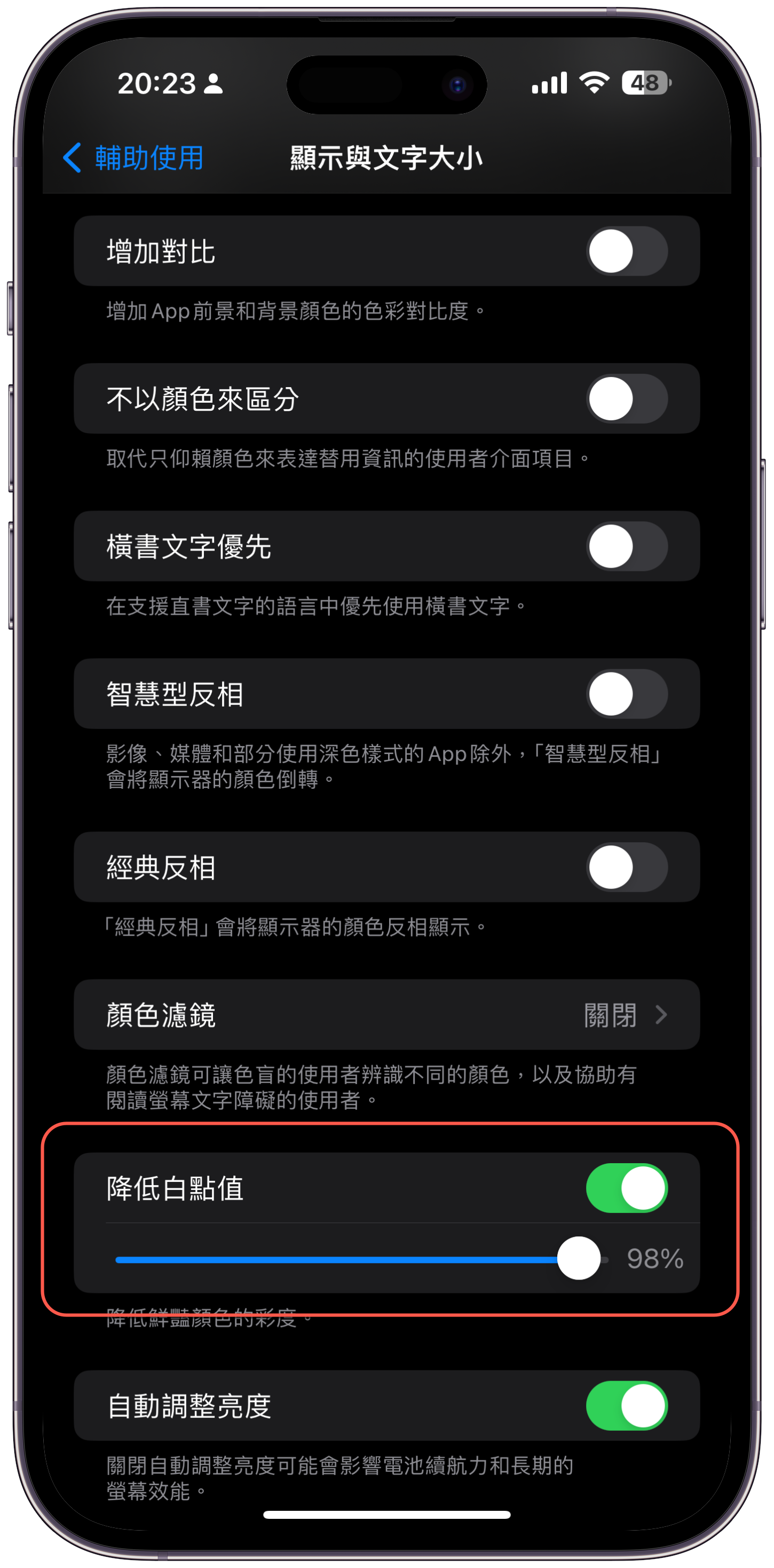 然後找到「降低白點值」,開啟後調整數值,愈往右白點愈少,螢幕看起來會愈暗(愈不刺眼),其實並不是實質的降低螢幕亮度,但透過這樣的設定,全關燈下,眼睛確實會舒適不少。