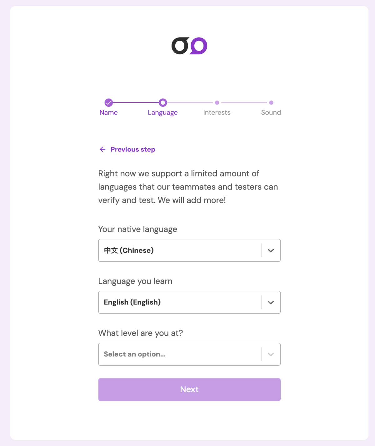 這邊會先問你的母語以及想要學習的內容,最後一個是你目前的語言能力,千萬不要謊報,你就是來學語言的,沒必要裝 B,自己多爛就選多爛,反正對方是 AI,就放心的學習吧。