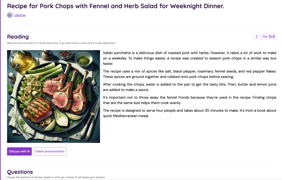 進入後會有一篇短文,點撃右上角的 Play 可以播放,AI 會唸給你聽,發音不會很機器,算是蠻自然的。