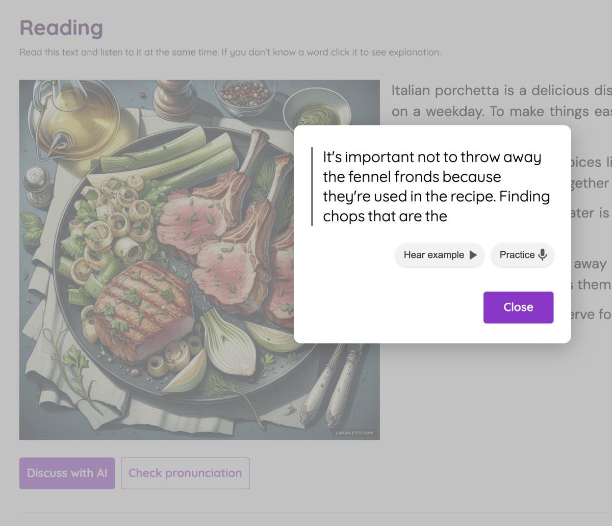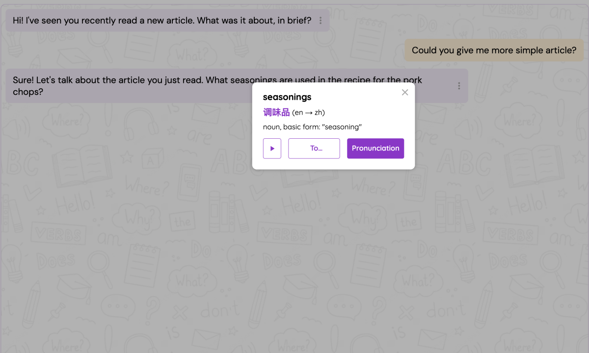 大部份這類的 AI 學習服務,不論是網頁或是 App 都是付費的,比如光是要和 AI 對話練習就都是付費的居多,一年下來大約是 2~3 千台幣不等,所以像 Lingolette 這服務真的超佛,聽說讀寫都練習的到,對話的部份也不會侷限在練習的內容,你也可以天方夜譚的和 AI 對話練習,其中我覺得最方便的就是單字快查,只要點撃就會顯示,這真的很方便。