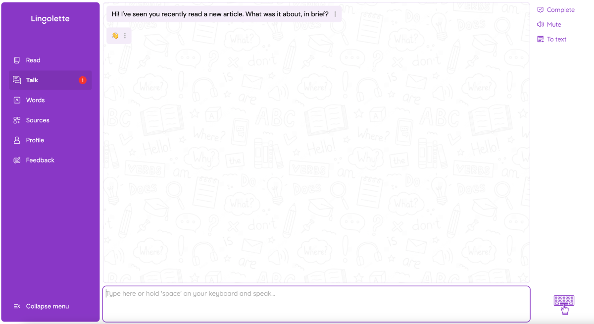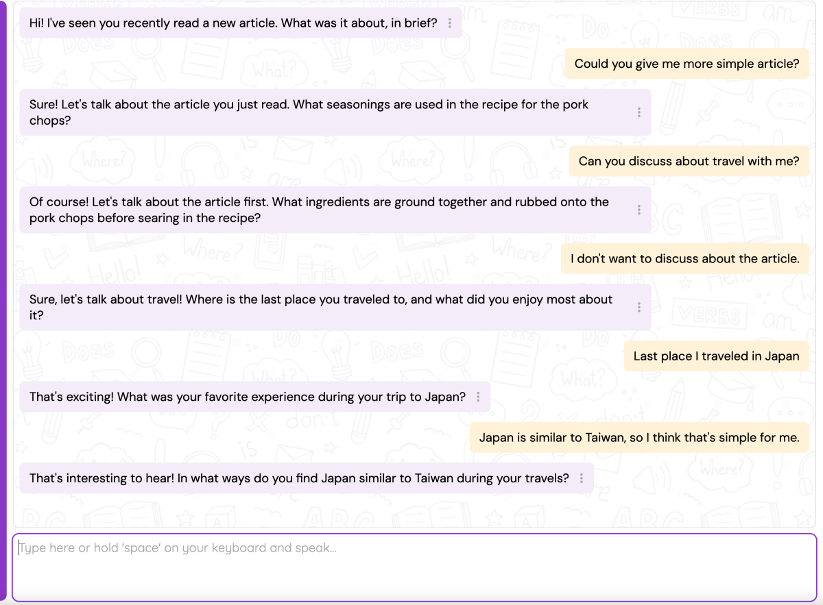 最後按下 Discuss with AI 就會跳到第二個 Talk,這功能主要是和 AI 對話,當你練習完文章後,他會想要和你討論文章的內容,會對你提出一些問題,問問你的想法、看法。