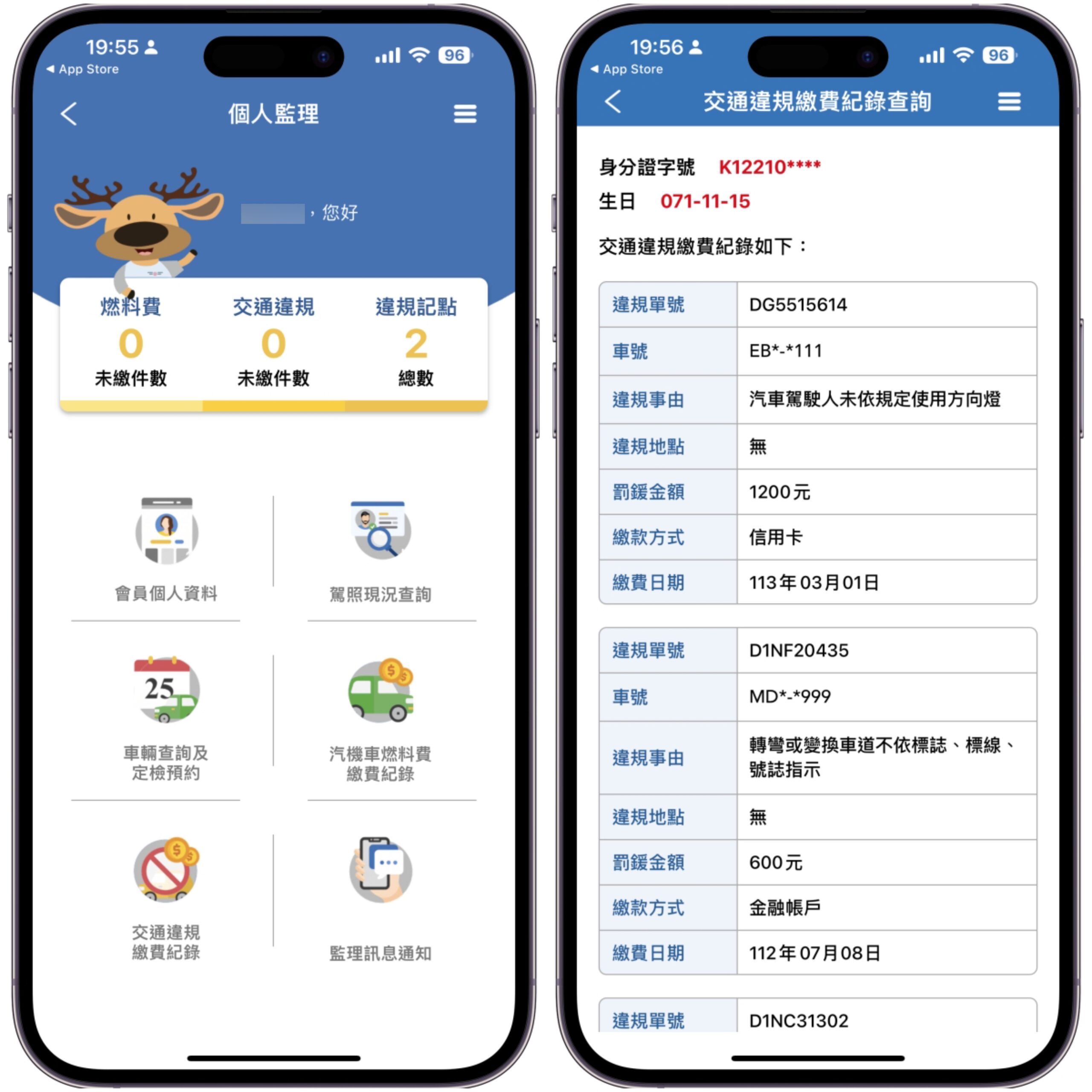 登入後在個人監理裡,最上方就可以查看燃料費是否有繳,交通違有幾件未繳,目前被記點多少,往下還有更多功能,比如像是交通違規繳費紀錄。