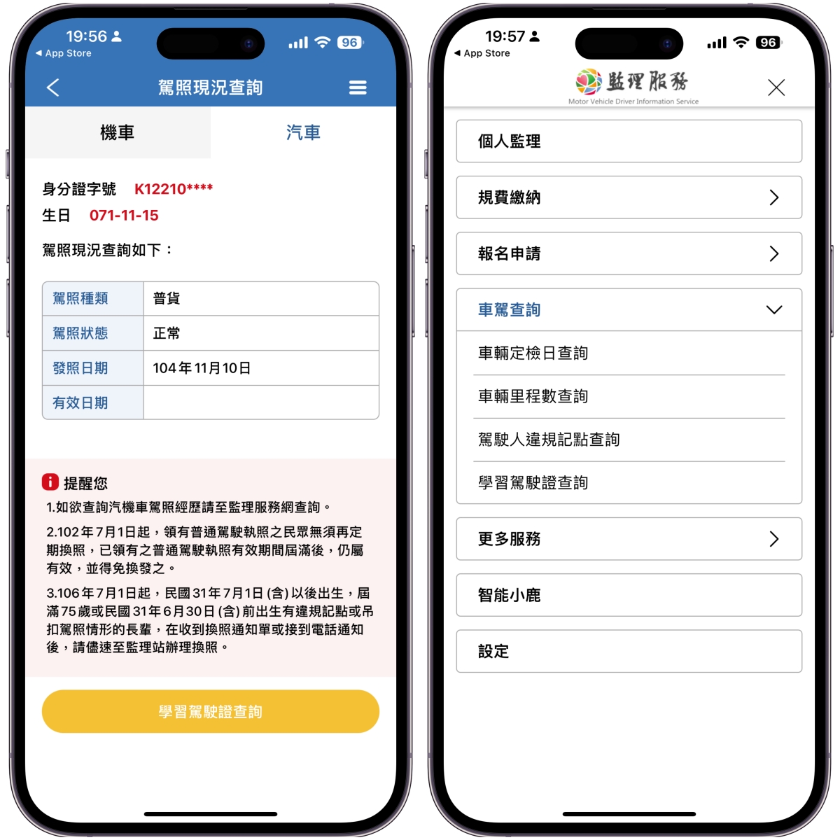 目前你自己的汽機車駕照狀況,還有車輛定檢日及里程數等查詢。