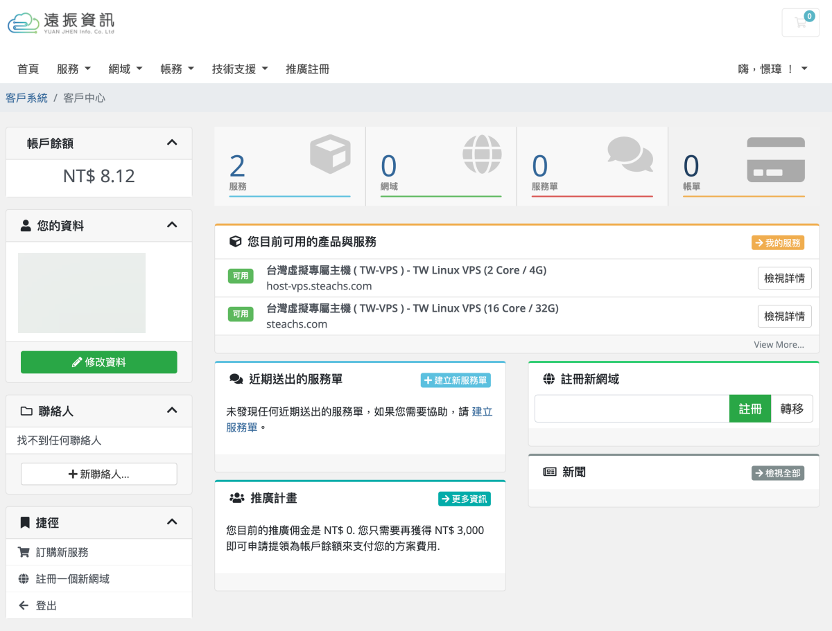 價格的部份,雖然台灣的主機業者比起國外貴了一些,但是相較以前,價格已經愈來愈接近,但你要想在台灣有中文服務,有電話服務,而且就我自己的使用經驗,台灣的主機商比起國外真的做的更好,而遠振資訊的服務在台灣也是老字號,穩定且品質很好。