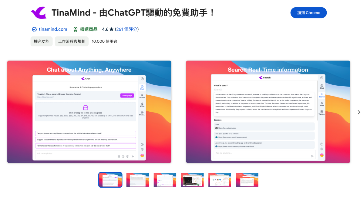 首先,TinaMind 是一款 Chrome 瀏覽器的擴充套件,所以可以在 Chrome 上或是 Edge 瀏覽器上使用,直接點撃加到 Chrome 後新增到瀏覽器。