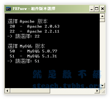 接下來選擇MySQL版本同上依個人需求選擇,站長選MySQL 5.1.31所以輸入51按Enter