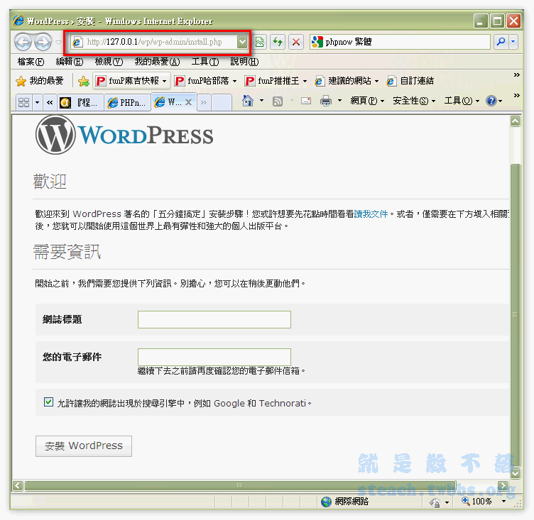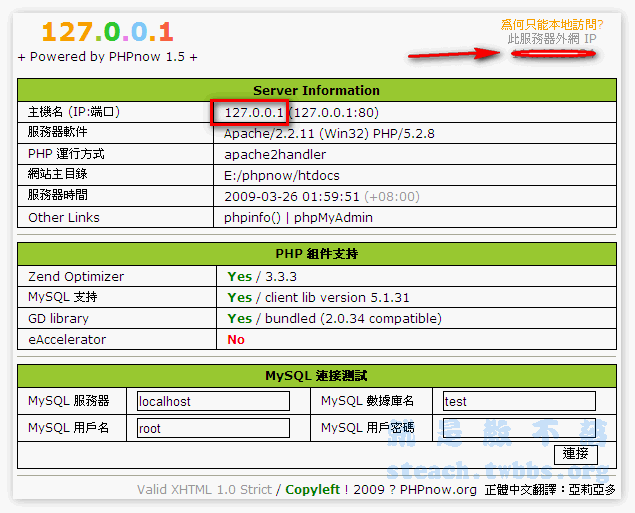 例如,站長丟個wordpress程式進去,設置一下資料庫連接資訊,測試一下,如果在本機測試的話,網址就是http://127.0.0.1/ 即可,如果要讓別人連接就使用