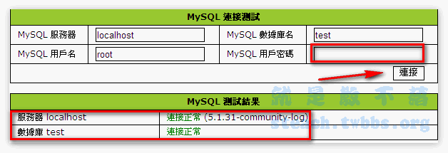 一開始建置完成時,會自動建立一個test的資料庫,輸入剛剛設定的SQL密碼來測試一下看看是否連接正常,如果非連接正常,可重新設置環境,選擇其它版本試試
