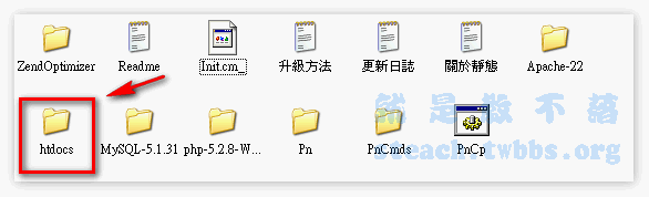 當設置完後,總共會有以下幾個資料夾與檔案,其中〝htdocs〞就是網站的根目錄