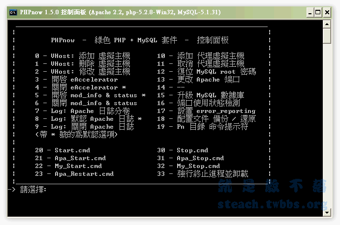 另外裡面還有一個執行檔為〝PnCp〞執行後可以用來設定一些參數,很方便,如果要《停用PHPNow選30,啟用選20,解除設置環境按33》其它可以自行研究一下哦!