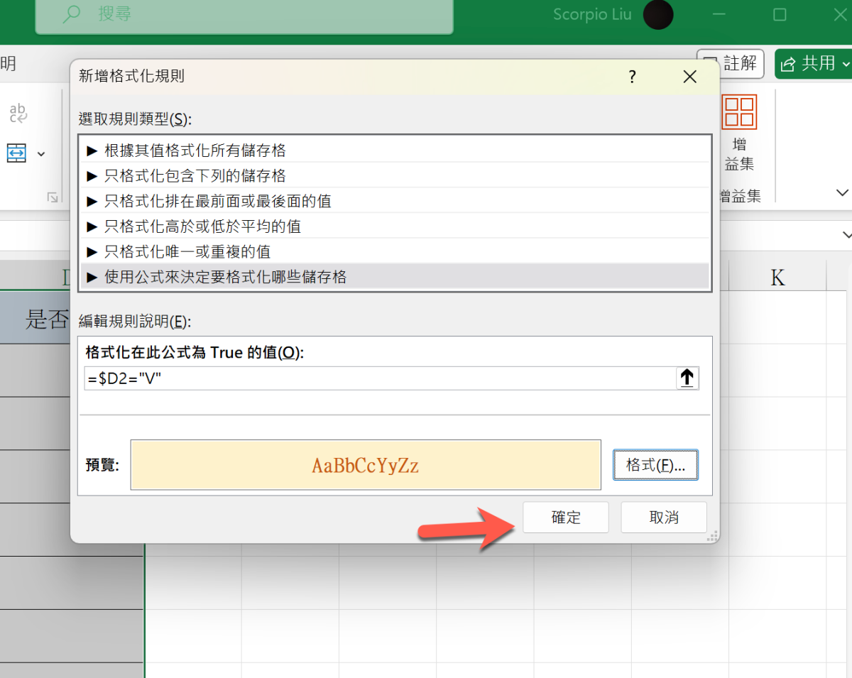 選擇「使用公式來決定要格式化哪些儲存格」,然後在下方格式輸入公式「=$D2="V"」,大概說明一下,D2 是填入是否中獎的第一欄,用 $ 符號固定 D 這個值,2 不用固定,要讓他自動往下套用,再來後面的 ="V",在雙引號中間的值就是你要判別的值,當 D 欄是 V 時才去執行要變更的格式,而要變更的內容,我們可以點撃右下角的「格式」。