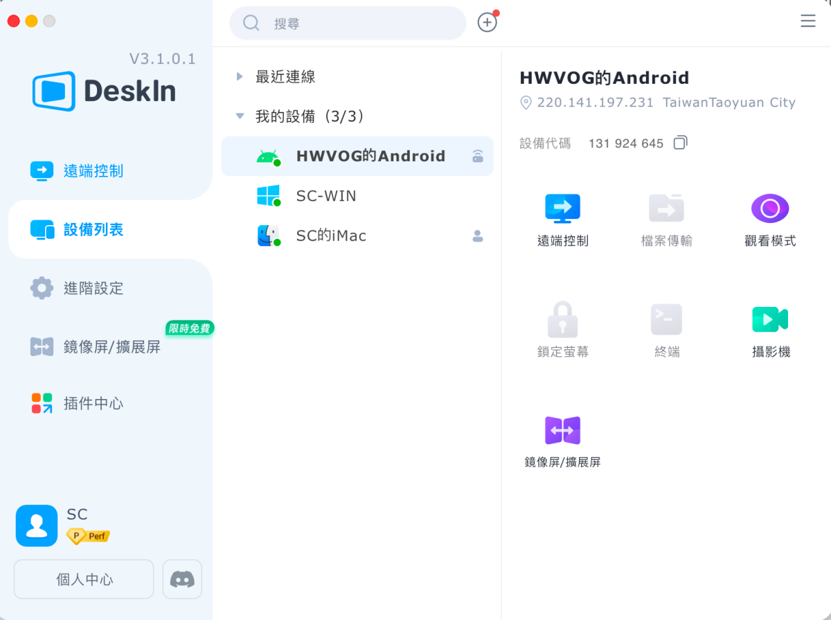 設備列表的部份,只要有登入相同帳密的設備,在開啟 Deskln 的情況下就會顯示在這裡,像我家中的電腦就都會隨時開啟,這樣在外面時,臨時需要家中電腦的什麼檔案,就可以直接連進去傳輸,或者像臨時需要其它工具來使用時,也能透遠端軟體來操作使用,就像在手機上裝了一台電腦的感覺。