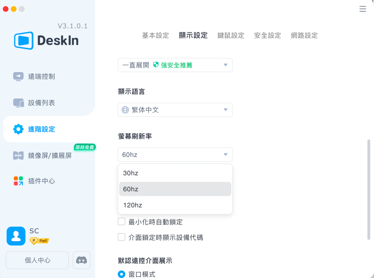 我覺得 Deskln 有一個很棒的地方就是可以設定幀率,這是很多遠端軟體的通病,就是透過降低幀率來提升畫面流暢度,但網路夠順暢的情況下為什麼要犧牲呢,在 Deskln 裡最高可以設定到 120hz,大家可以依自己的連線環境來選擇,不過現在都 5G 時代了,這應該不成問題。