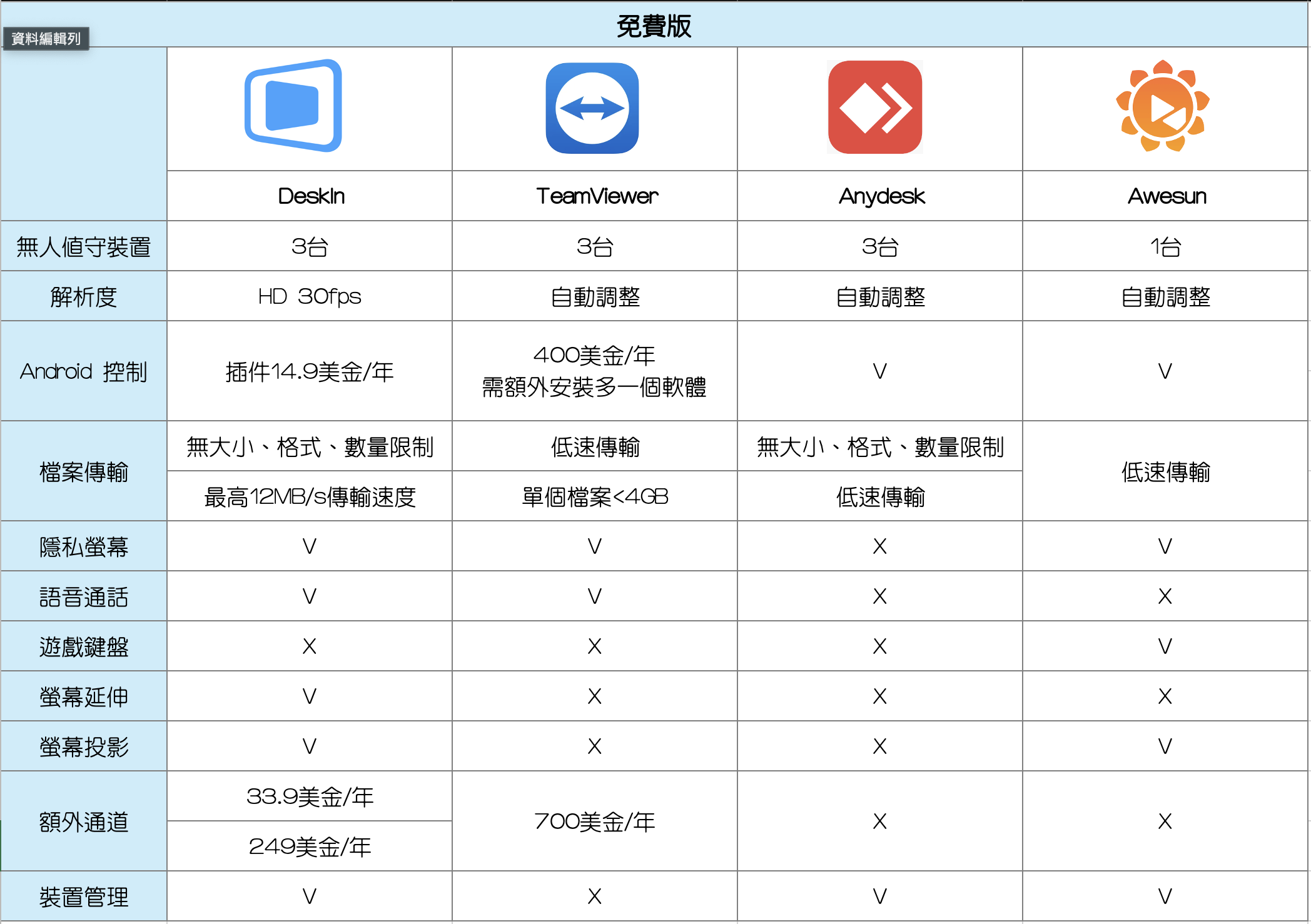 首先,遠端桌面軟體的功能,基本上大同小異,就是能夠透過網路連接別的設備,而目前能夠控制的,Windows/MacOS 電腦都可以被控制,手機的部份目前僅有 Android 系統可以被控制,iOS 主要是系統未開放,而做為控制設備,則是各家系統都能夠支援,講到這裡,大家應該會想說,既然大同小異,那還有什麼好選擇的?不是隨便選一款都可以嗎?不不不,魔鬼當然是藏在細節裡,這邊我們先分成二個部份,首先我們來看看 Deskln、TeamViewer、Anydesk、Awesun 這四家桌面遠端軟體,免費版的一些差異。