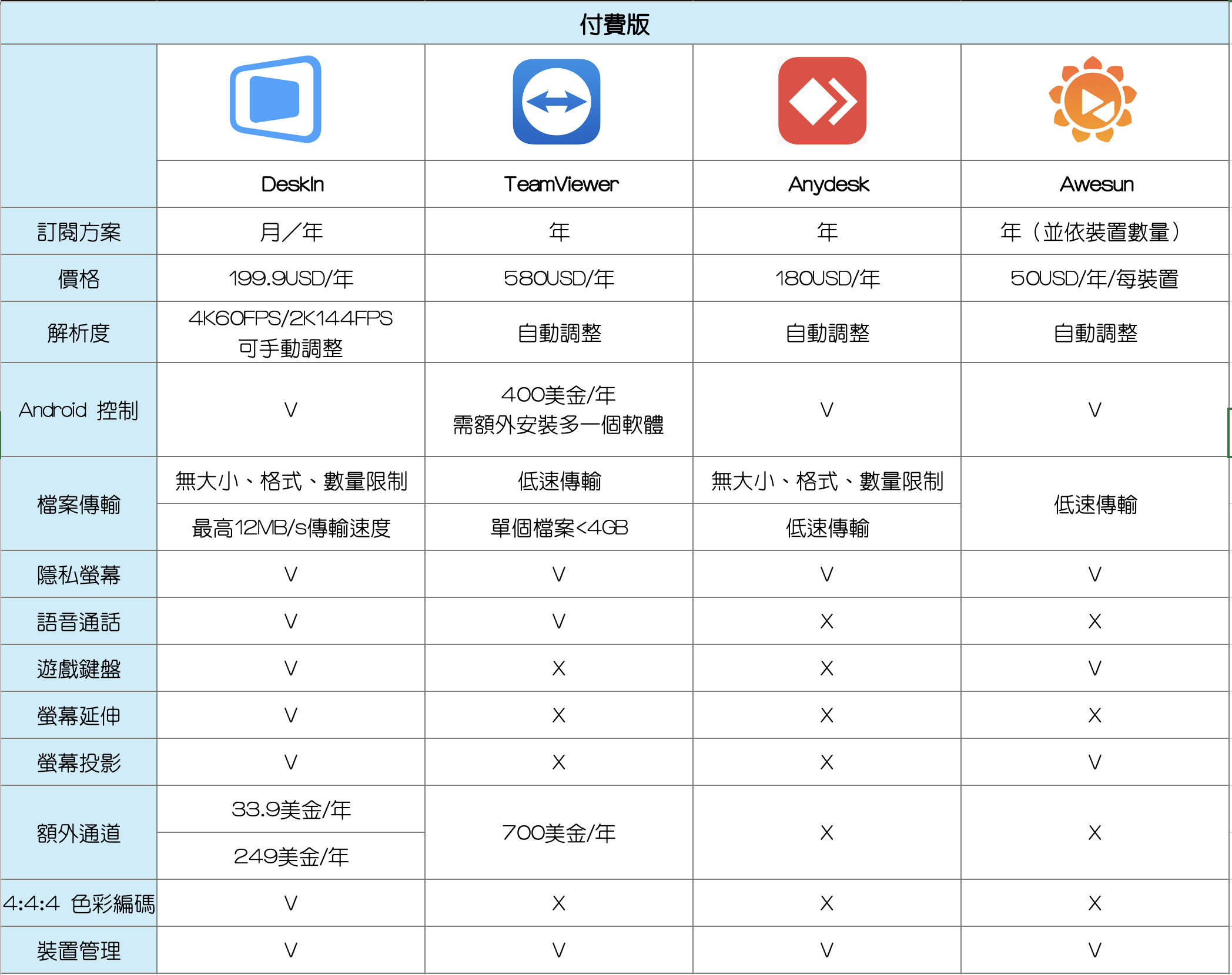 最後我覺得比較重要的是像語音通話、遊戲鍵盤、螢幕延伸跟螢幕投影這些輔助功能,不算是常用到,但是很實用的功能,比如遊戲鍵盤,這對很多利用遠端玩遊戲的人來說應該非常實用且重要。其它的功能,基本上原本免費版就有的就有,付了錢還是不會有,就不要期望太高了,所以就付費版來說,我自己的順序和免費版基本一樣 Deskln > Anydesk > Awesun > TeamViewer,不過最後二個要對調一下,因為 TeamViewer 真的好貴,但又沒特別好用。