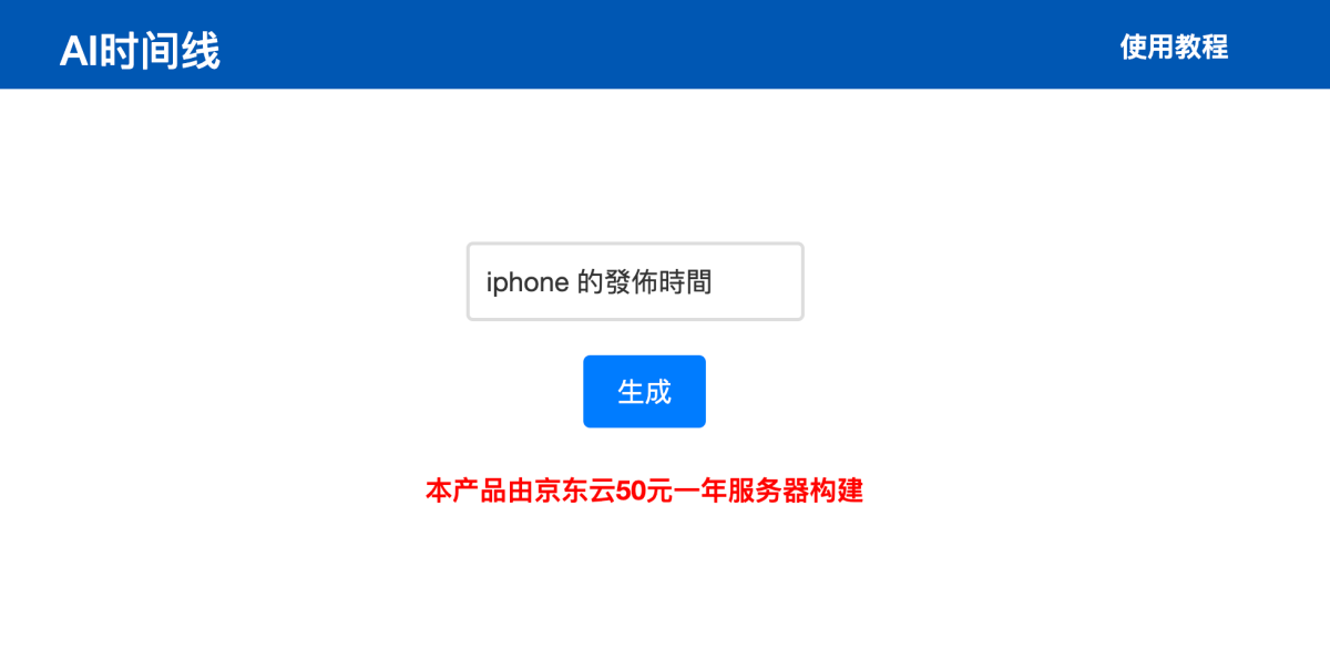 網站:http://www.ai-timeline.top/首先,輸入欄位只有一個,不一定要短短的內容,描述也可以多一點,另外,預設是顯示簡體中文,如果你想繁體中文,記得在後面加上用繁體中文顯示就好。