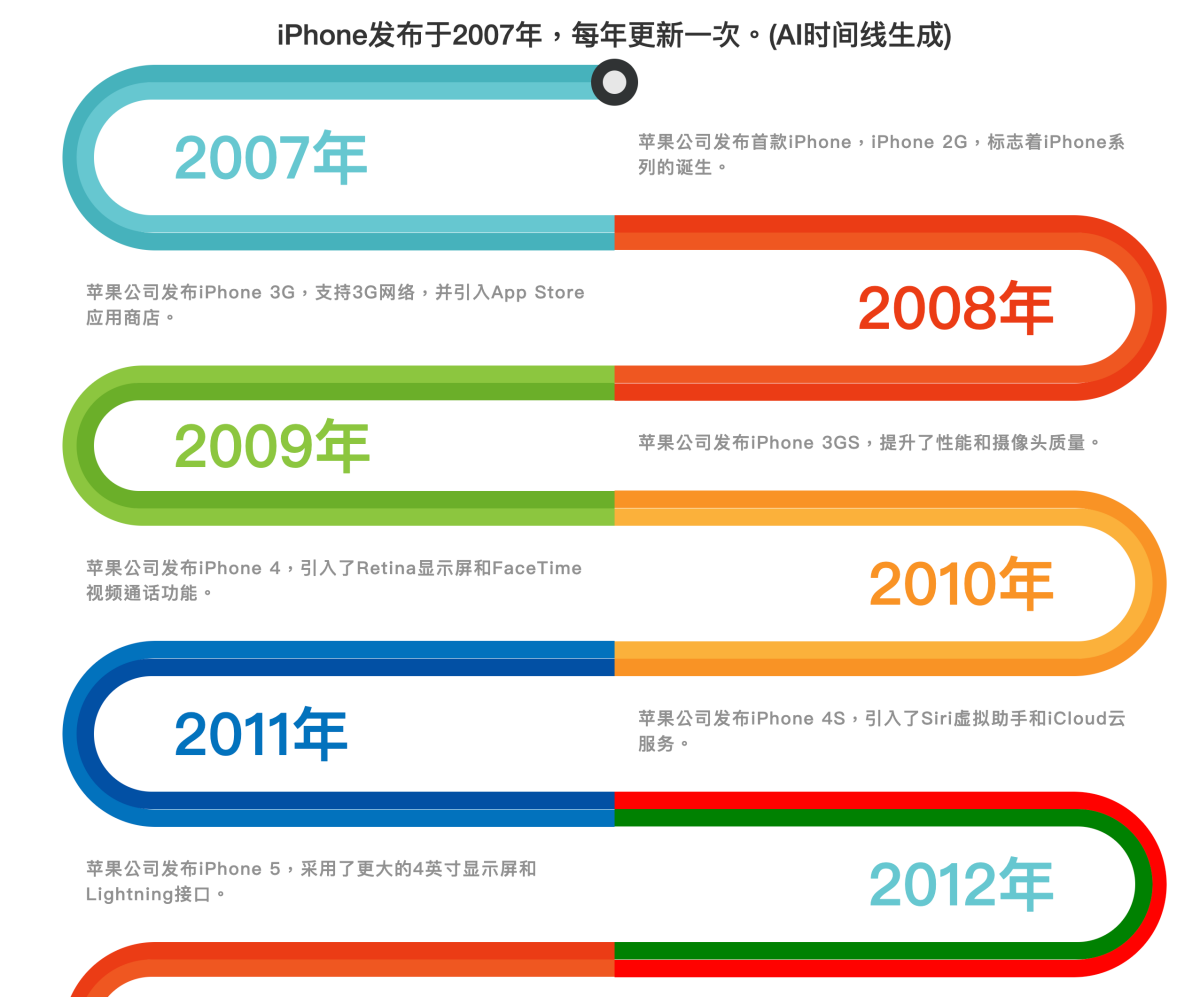 這邊我就先照預設來生成,比如 iPhone 的發展歷史,簡單打個指令就能生成出來。
