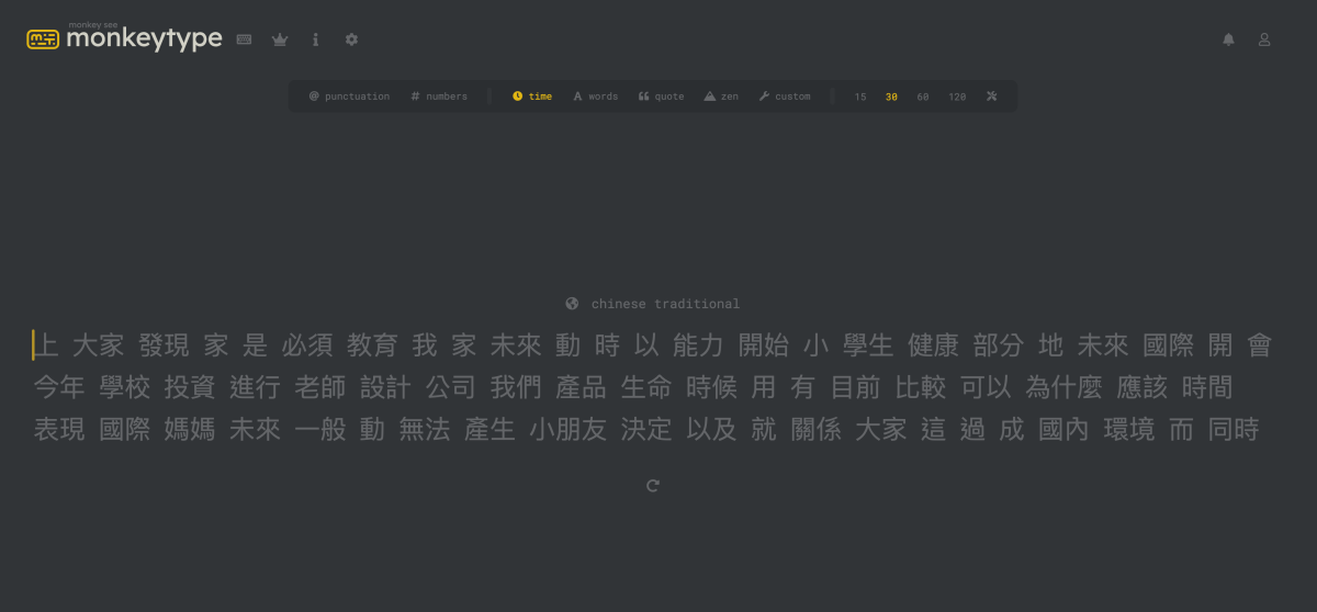 網站:https://monkeytype.com/進入網站後預設是英文打字,中間的地球圖示點擊後就可以切換想要練習的語言。