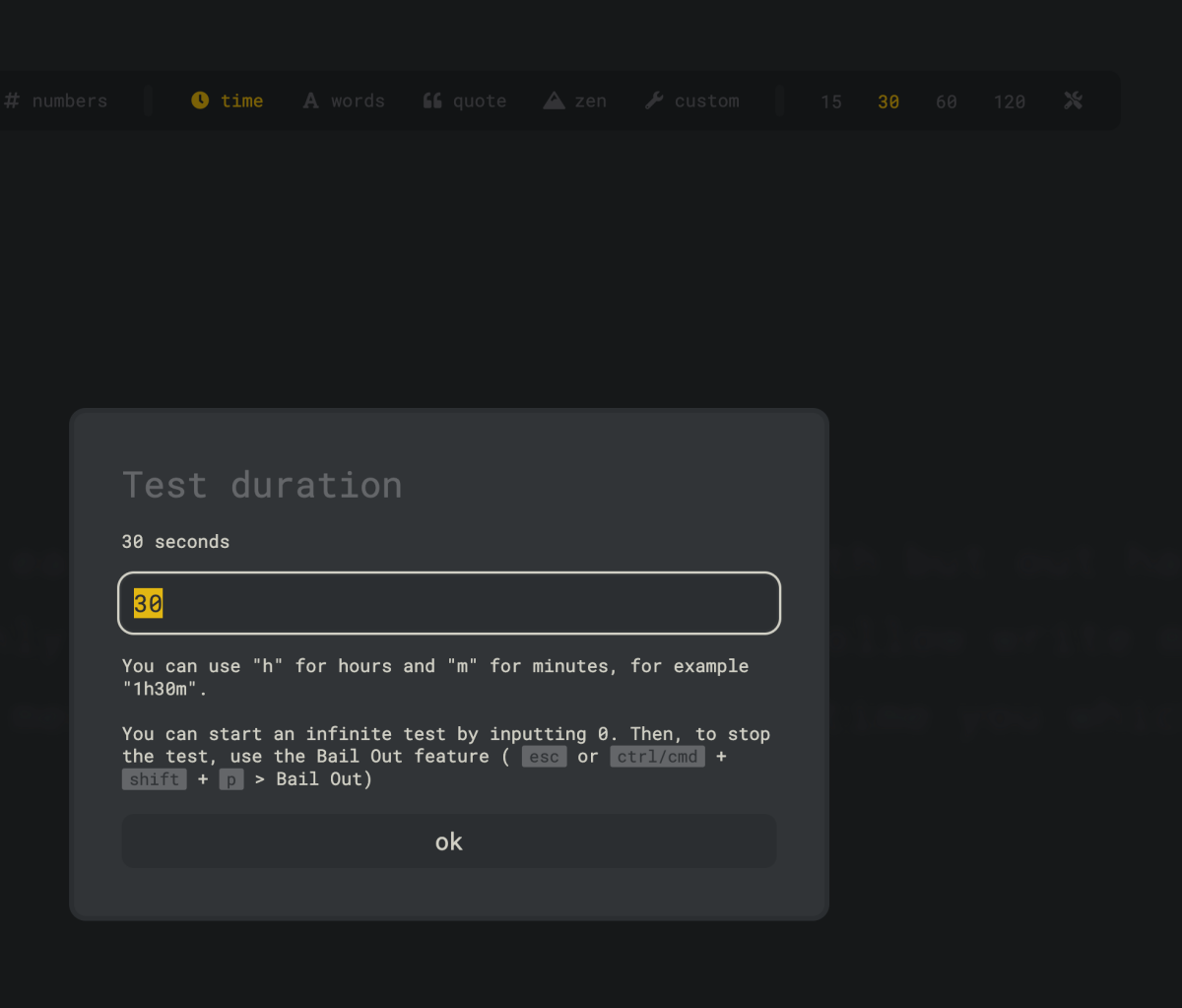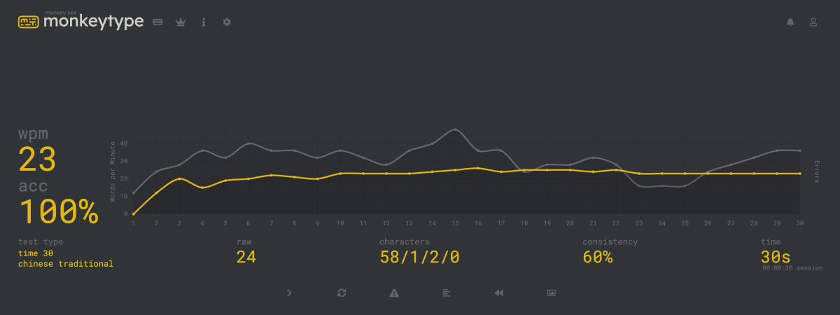 上方點擊 time 後可以設定每一次要要練習多久,倒數完後會幫你計算打字的數度、錯誤率等。