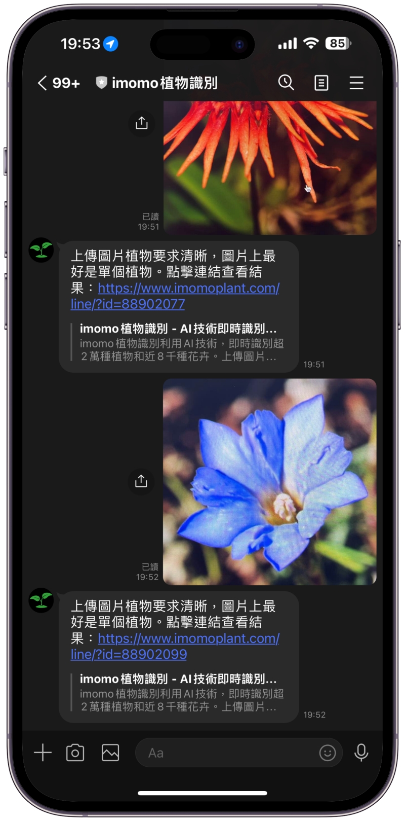 每次阿湯去爬山時,都會看到很多沒看過的植物,之前都是用 Google 以圖找圖的功能來辨識,但有些特別的很常辨識不出來,比對的完全不同,但對我這好奇寶寶來說,真的想要知道啊,最近發現了一個可以用來辨識植物的好工具叫做 imomo 植物識別,內建超過二萬種植物的資料,而且支援 LINE 直接上傳照片進行比對,馬上就可以得到結果,實在太方便了,下次我爬山要直接查爆。