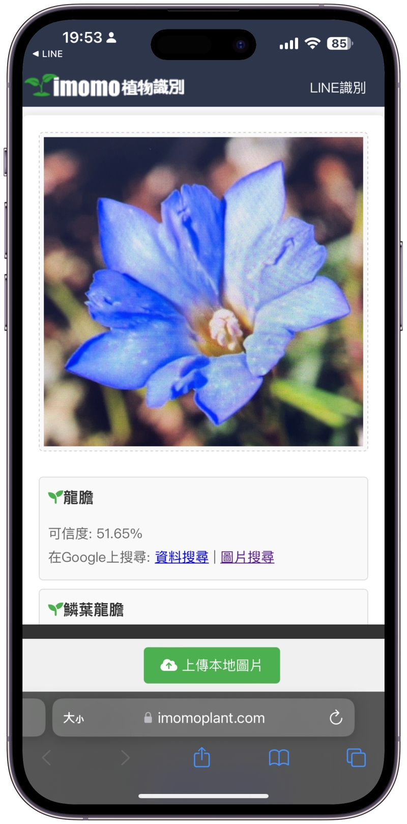 加入後直接在他們的官方帳號上傳植物照片就可以了,上傳後辨識出來就會顯示查詢的結果連結給你,這也是比較可惜的,如果可以直接在 LINE 上回覆結果就更棒了。