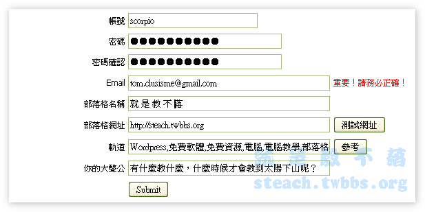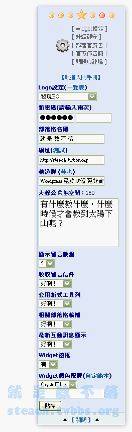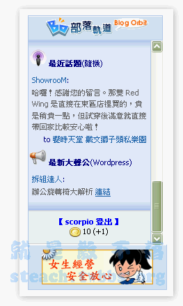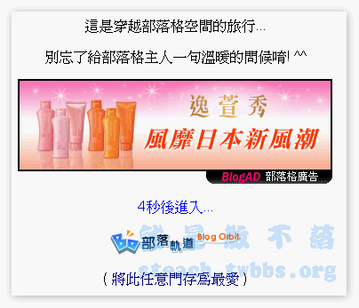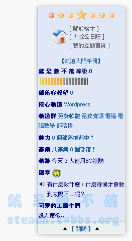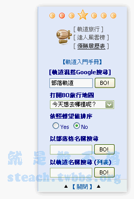 讓更多人知道你,但不是用了就會增加,而是要靠自己多多的與他人互動,互相支持,才是經營部落格的不二法門哦!不過還是趕緊上軌道,把你的部落格送往四面八方吧!!在申請完軌道及了解了各項功能介紹後,趕緊進階的再往下看看站長如何BO吧