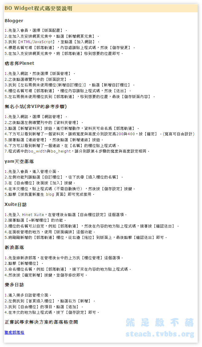 如果你不知道你該怎麼將程式碼安裝到你的部落格,在底下就有各類部落格的說明囉