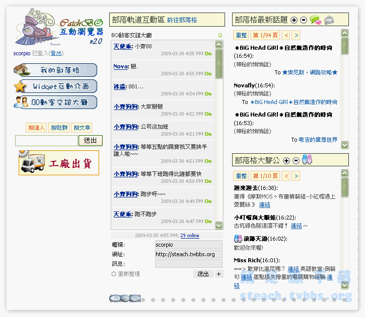 如果在別人的部落格上點下去則可以留言或打工,留言就像中間的圖一樣,每次