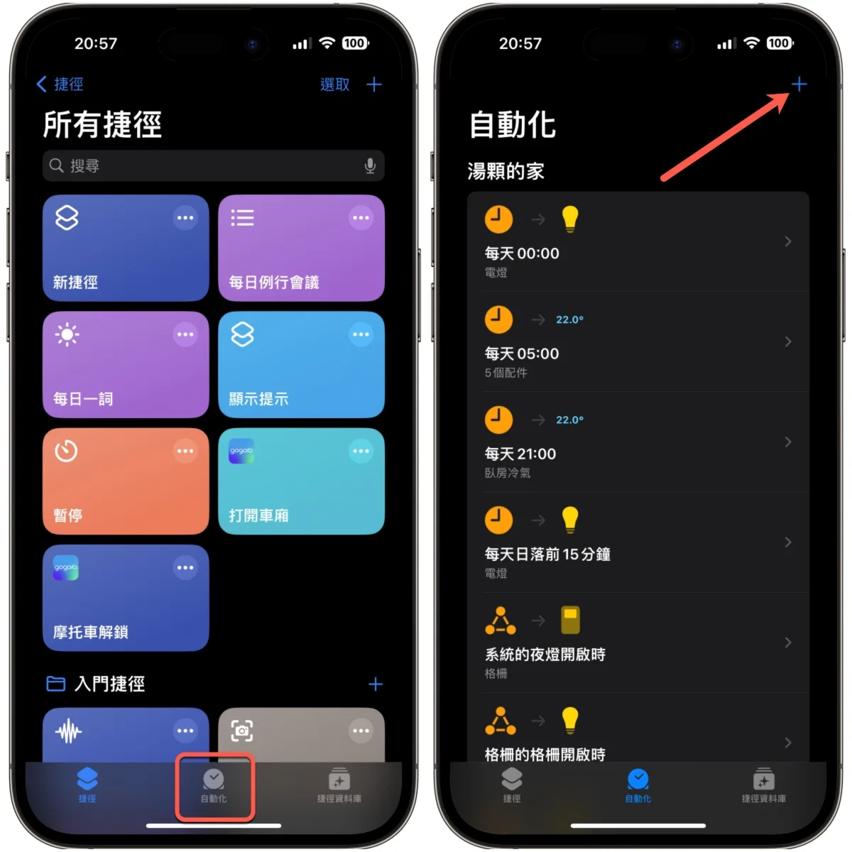 首先開啟 iPhone 中的捷徑 App,然後下方點擊中間的「自動化」,再點擊右上角的新增自動化。