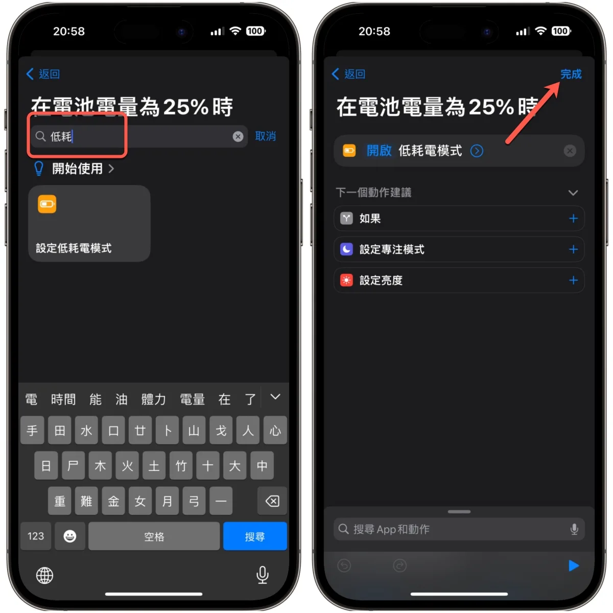 然後執行的內容當然就是選擇「設定低耗電模式」,最後按下完成即可,這麼一來在 25% 時就會自動啟用低耗電模式來降低耗電量,進一步的保護你的電池使用。