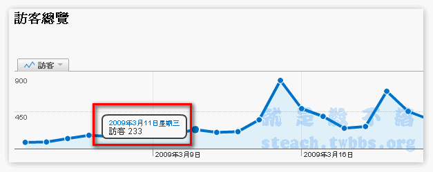 其中最上面會有一個曲線圖,是你網站目前為止每天的訪客曲線圖,但不只是如此而已,請看下一張圖